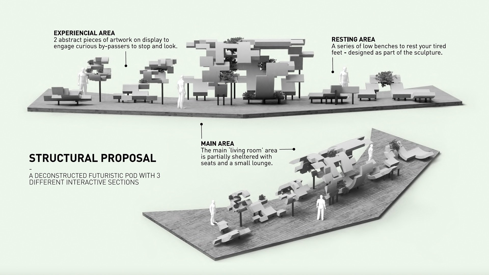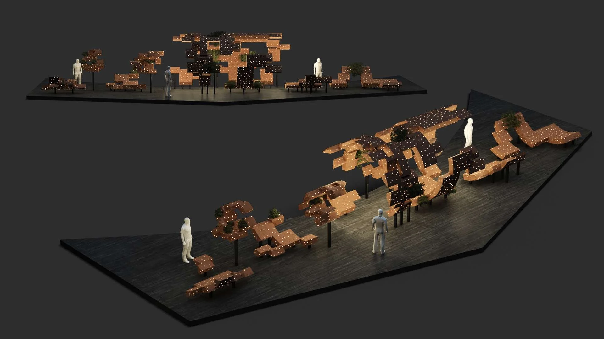 The sculpture’s lush, wooden facade is made from 100% reconstituted timber— harvested from all parts of the tree to minimise wastage—while the native Pilea plants that adorn it absorb carbon from the air.