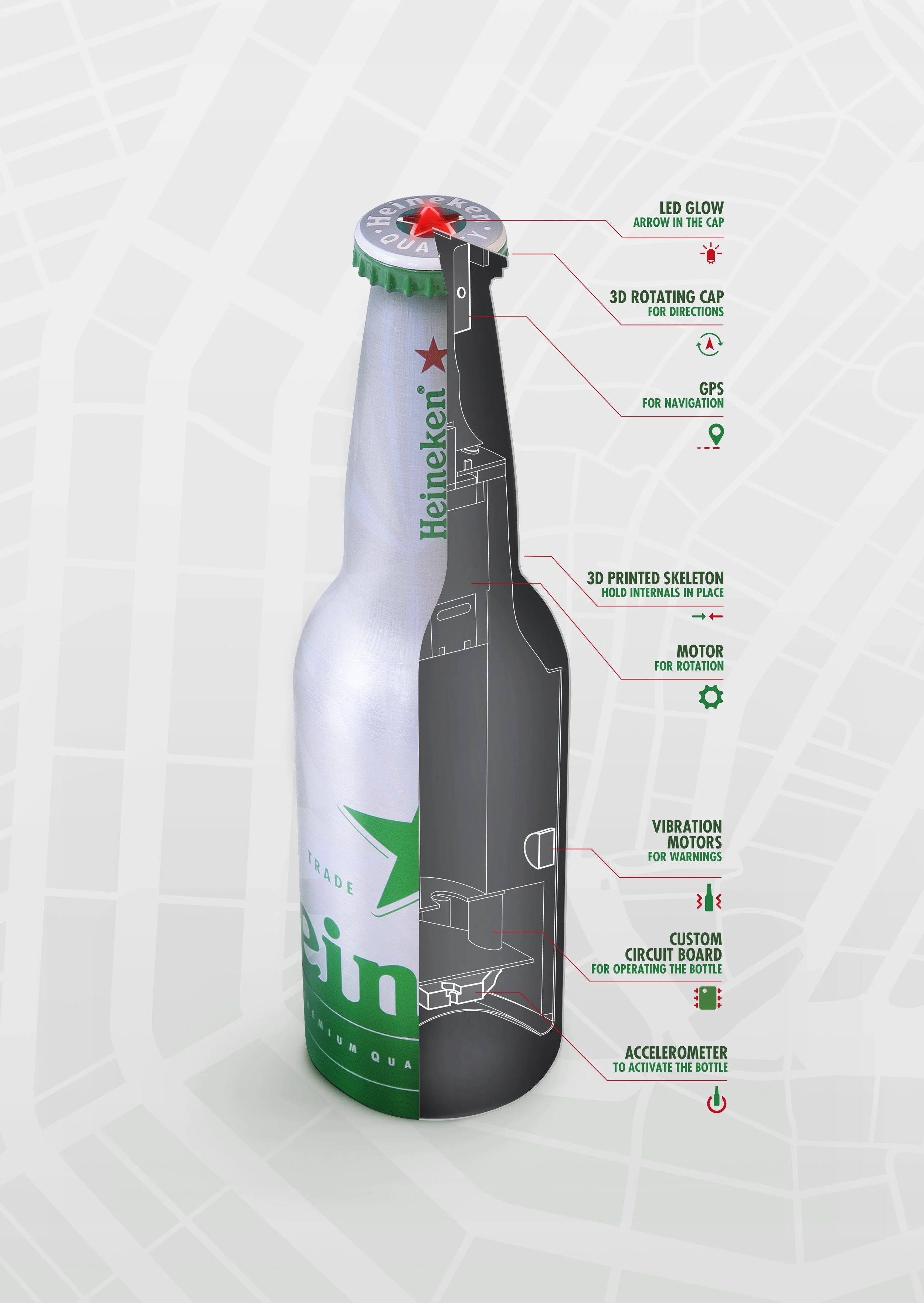 We created a 3D-printed body, to fit precisely inside the Heineken bottle and hold the sensors and motors in place. There is a gps system and a compass in the neck of the bottle and a motor in the bottom, which is moving the cap. The heart of the bottle is formed by a circuit we had custom-printed, to control all the sensors and motors.